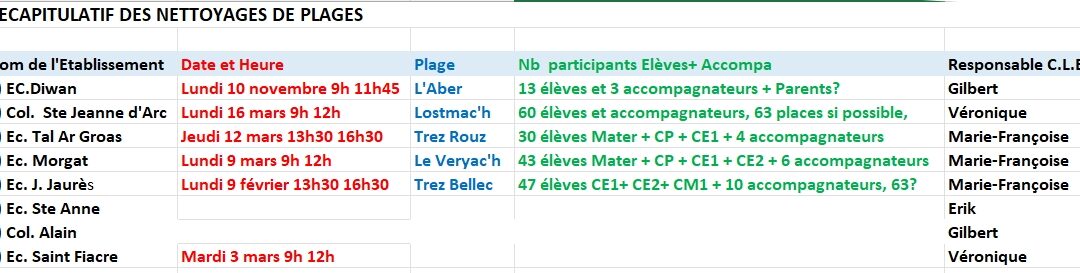 Pour celles et ceux qui seraient intéressés pour participer aux nettoyages de plages que nous organisons avec les écoles, je vous mets en pièce jointe le calendrier de ces nettoyages.